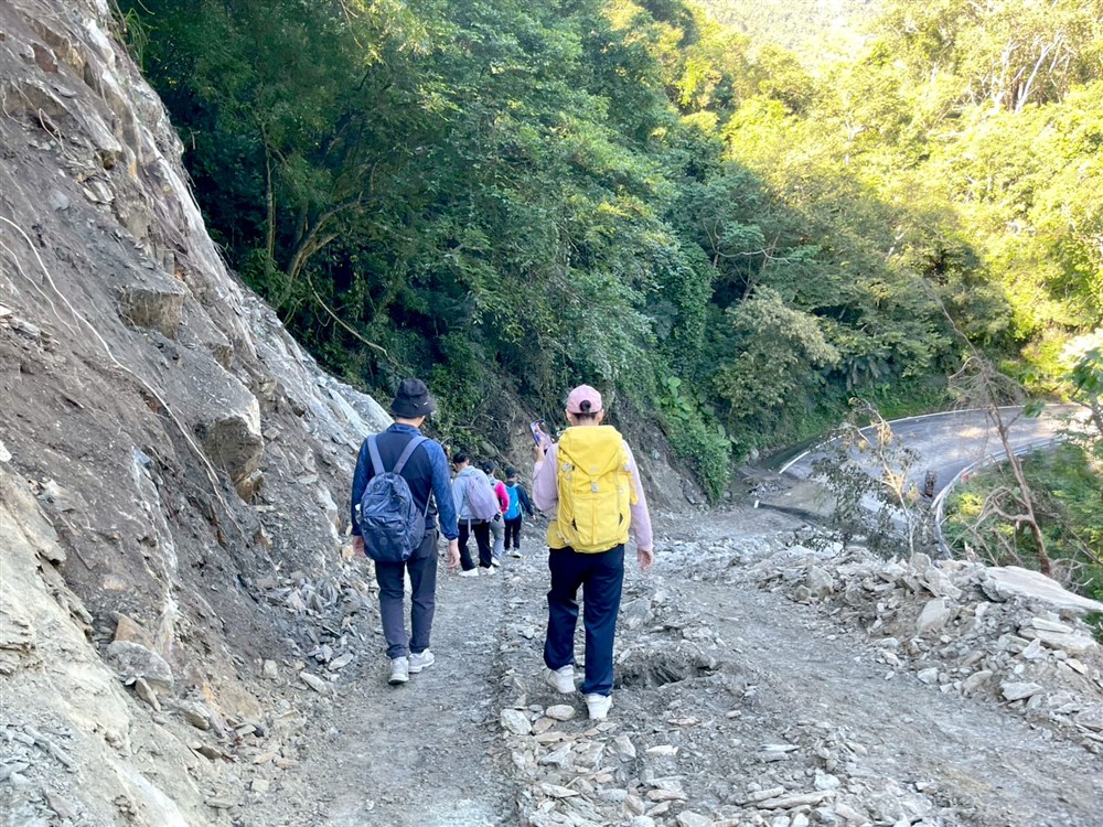 南橫公路因多處坍方、道路中斷,醫療團隊以徒步前往部落。圖/關山慈院提供