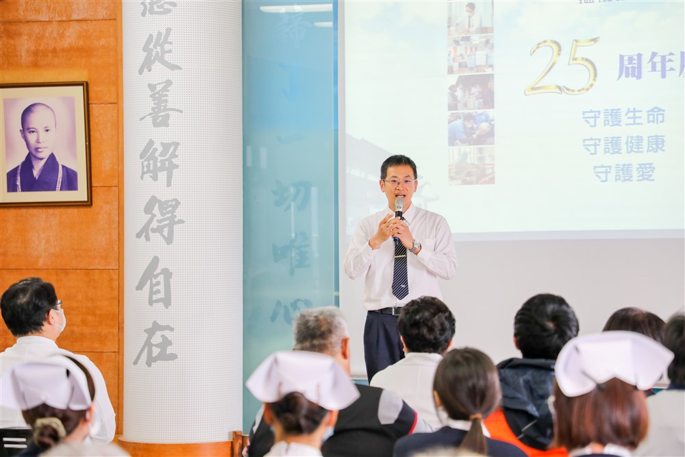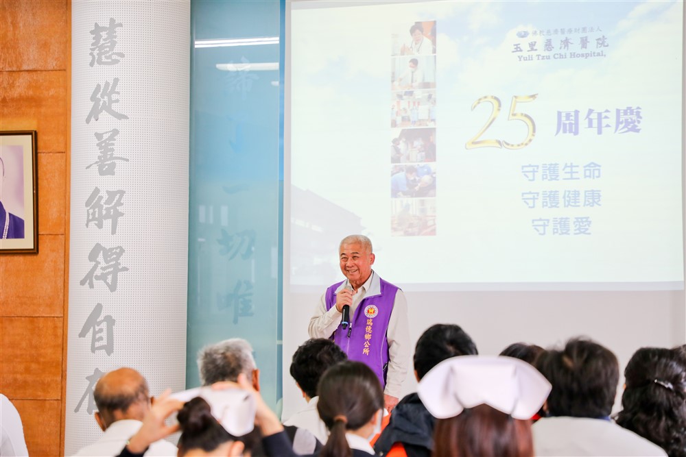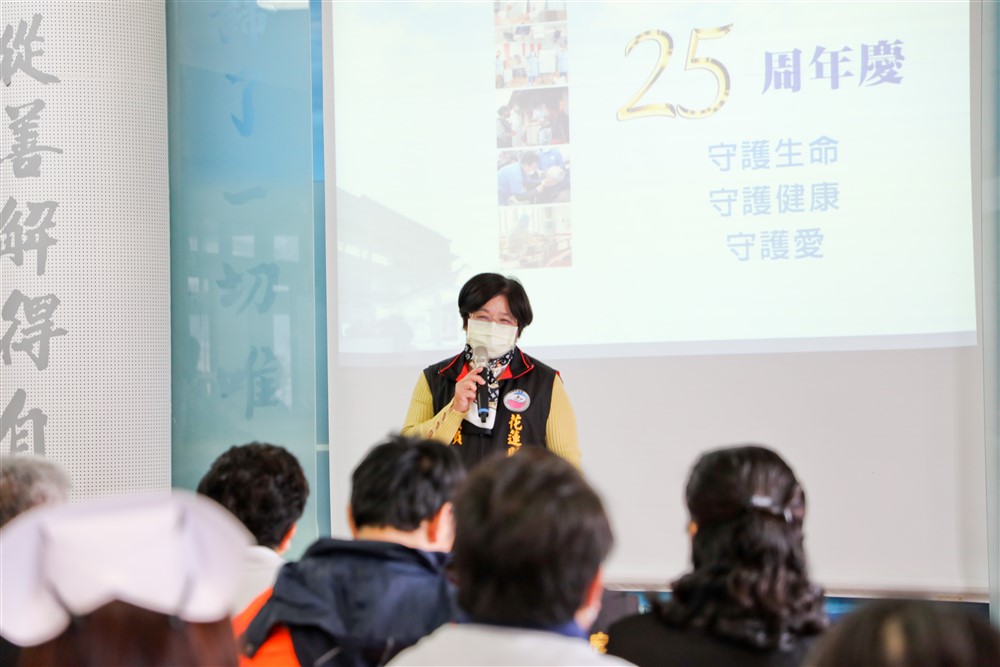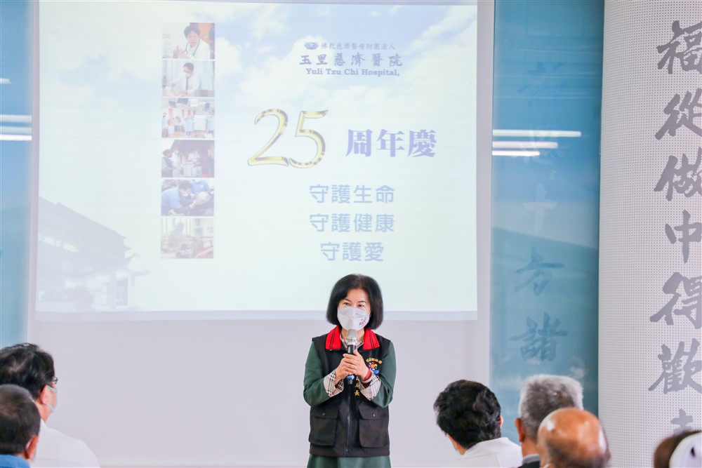 陳岩碧院長致詞首先提到,玉里慈院致力於守護民眾的生命與健康,近年更積極拓展社區醫療,像是居家護理、居家長照、失智共照等,再加上洗腎室的啟用,不斷的求新求進,為花蓮南區的鄉親提供多元化的醫療服務。陳院長有感而發,二十五年來因為有歷任院長的付出,才有今天的玉里慈濟醫院,「緊急醫療照護的經營很不容易,我們效法上人難行能行的精神,承擔這個米籮,所有的同仁與社區志工們合和互協,秉持初衷繼續堅守崗位,做在地的靠山。」