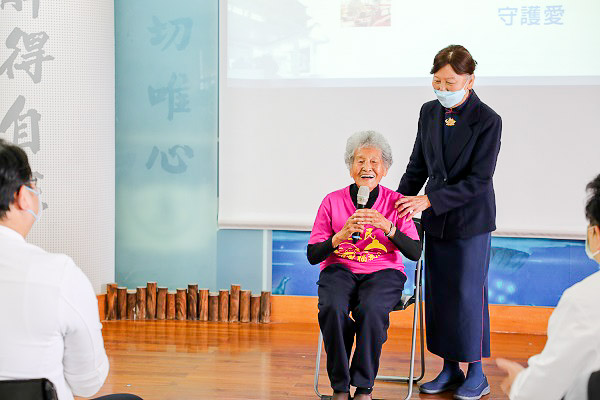 會中邀請了四位長輩,分別來自社區關懷據點、門診病友、急診搶救個案,談談他們與玉里慈院的美好情分。首先是九十六歲的林秀月阿嬤,自從到三民福氣站上課,十八年以來,沒有一天缺課,「我很歡喜,常常在學校很開心運動,身體很健康。」可說是高齡模範生。