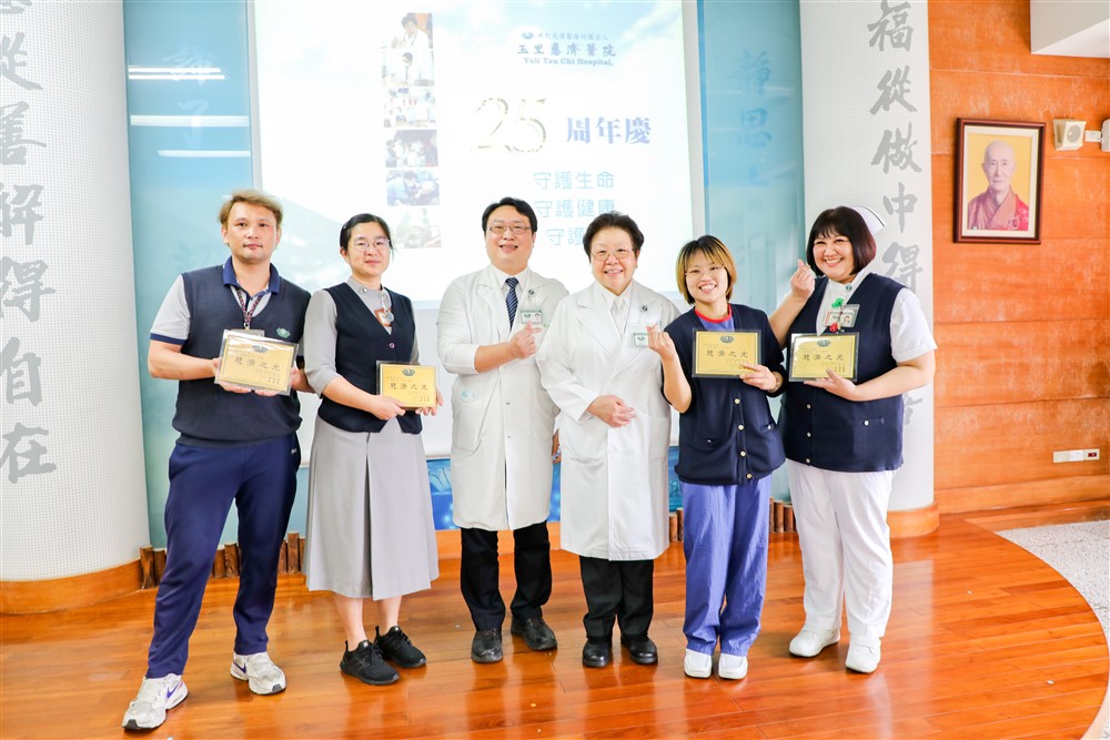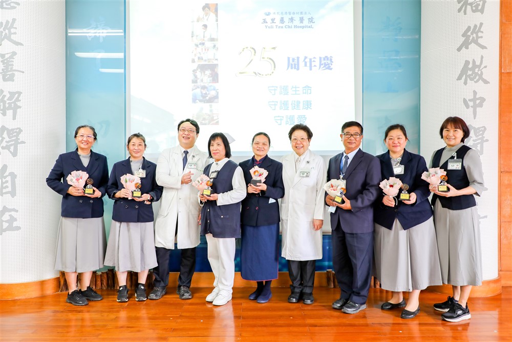 玉里慈濟醫院二十五歲,感恩服務二十五年的同仁(左起):陳靜緹、劉勁妤、頒獎人林副院長、古英梅、樊幼茹、陳院長、莊永欽、張嘉玲主任、陳秀金組長。