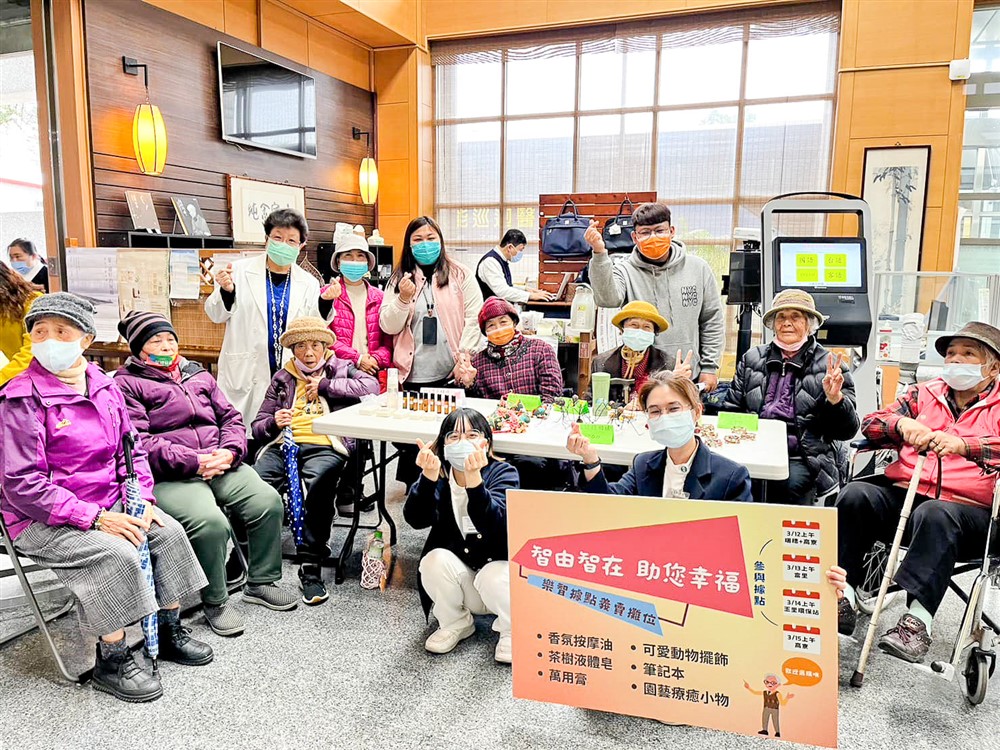 樂智據點的長輩們也帶著手工藝作品來設攤義賣。第一排右為護理科郭雅萍主任。