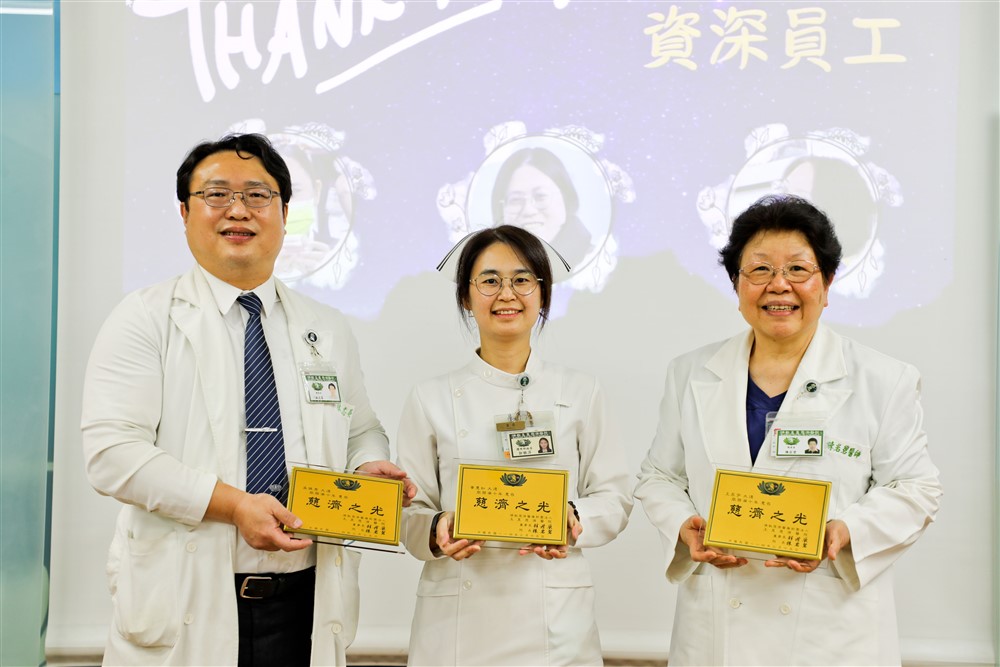 感謝玉里慈濟醫院服務二十周年同仁,左起:葉雲鑑副護理長、陳岩碧院長、董民基醫師、林志晏副院長。