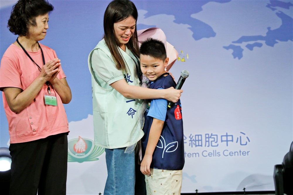 「結婚之後,我也生了小孩,現在是兩個孩子的二寶媽,受贈者他可能因為注射了我的造血幹細胞,可能會跟我長得很相似,我感覺自己好像生了一個小BABY 一樣。」現在的陳瑜萍是個二寶媽,捐贈造血幹細胞,不但不影響生育,還孕育新生命。睿睿在相見歡這天靦腆地向瑜萍獻花致謝,「謝謝妳捐骨髓(造血幹細胞)給我,讓我能健健康康地長大,沒有妳的大愛,就沒有現在的我,未來也要向姊姊看齊,做一個有愛心的人,努力幫助別人。」
