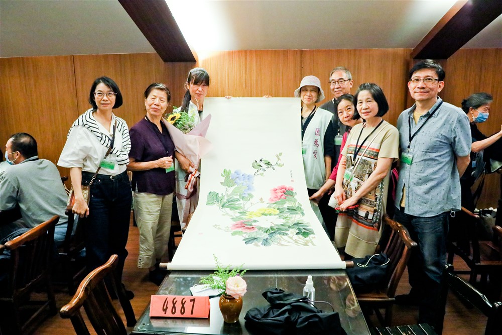 劉豐來(右五)送給捐者曾惠平(左三)自己畫的花鳥國畫和親手做的紫膠蟲布染。攝影/林群傑