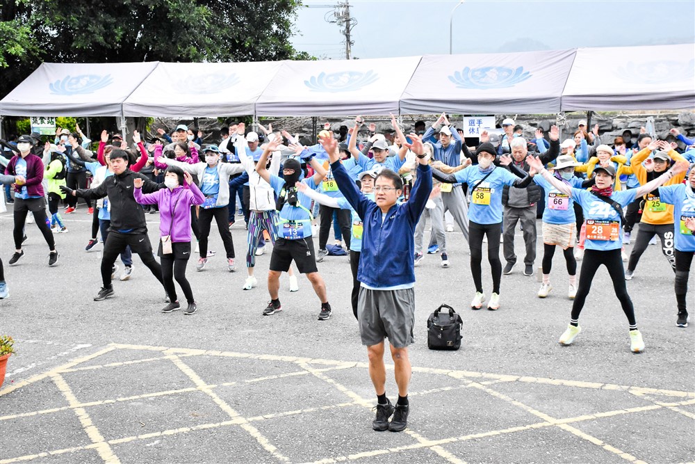 關山慈濟醫院喜迎二十四周年,三月十日舉辦院慶路跑暨健走活動,開跑前,潘永謙院長(前)帶領選手們一起做暖身運動。潘院長後方為資深慈濟志工蔡堆部長(號碼布58 者)。
