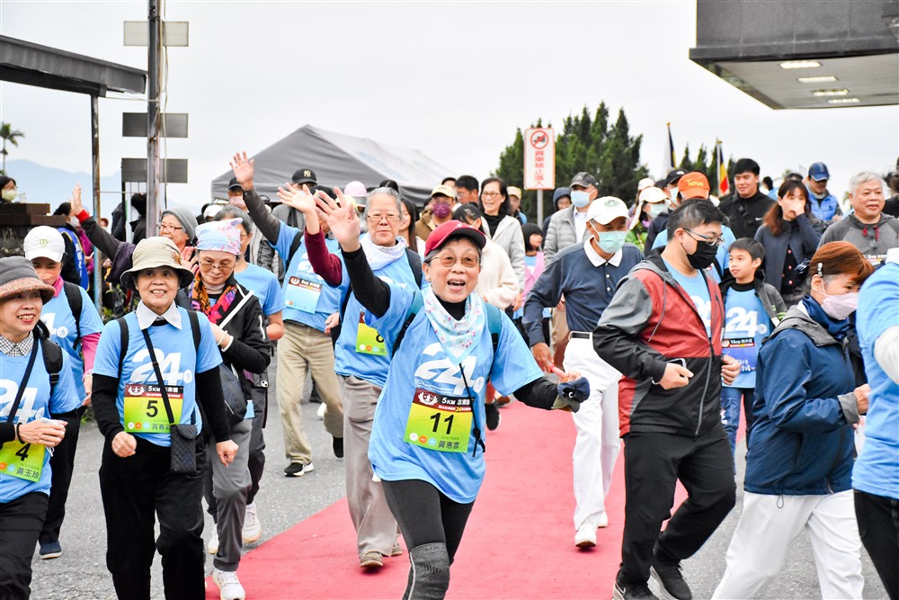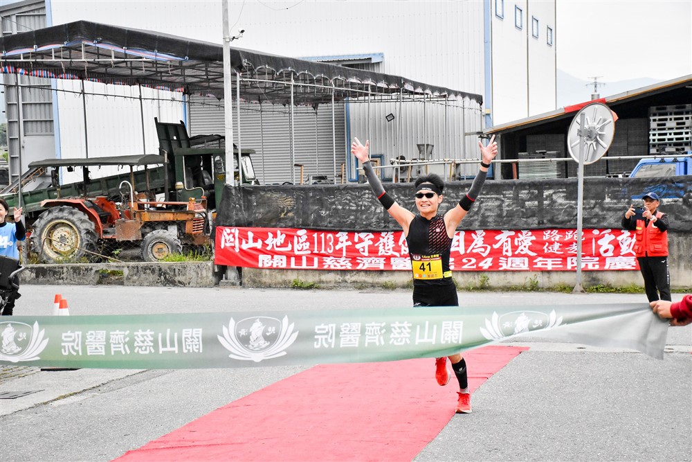 關山慈院潘建志物理治療師再度挑戰參賽,去年就為自己擬定目標,苦練下終於獲得好成績,僅花了五十八分零八秒就抵達終點,成為總排名第一的選手,迎來眾人掌聲和歡呼。比賽的名次雖然有前有後,但最寶貴的是那份屹立不搖的堅持。蔡堆部長是十四公里組最年長的選手,七十七歲的他,透過規律運動習慣保持健康,只見部長一路笑臉迎人,不拼成績,而是享受在健康慢活的美好當下。「關山慈濟醫院舉辦廿四周年院慶路跑,是結合社區還有所有慈濟人共同促進健康的最好方式,尤其在疫情之後社區的健康很重要!今天很高興看到這麼多的慈濟人來到這裡,好幾個團體專程從臺北和花蓮包車下來,也希望大家繼續共同努力,保持健康!」