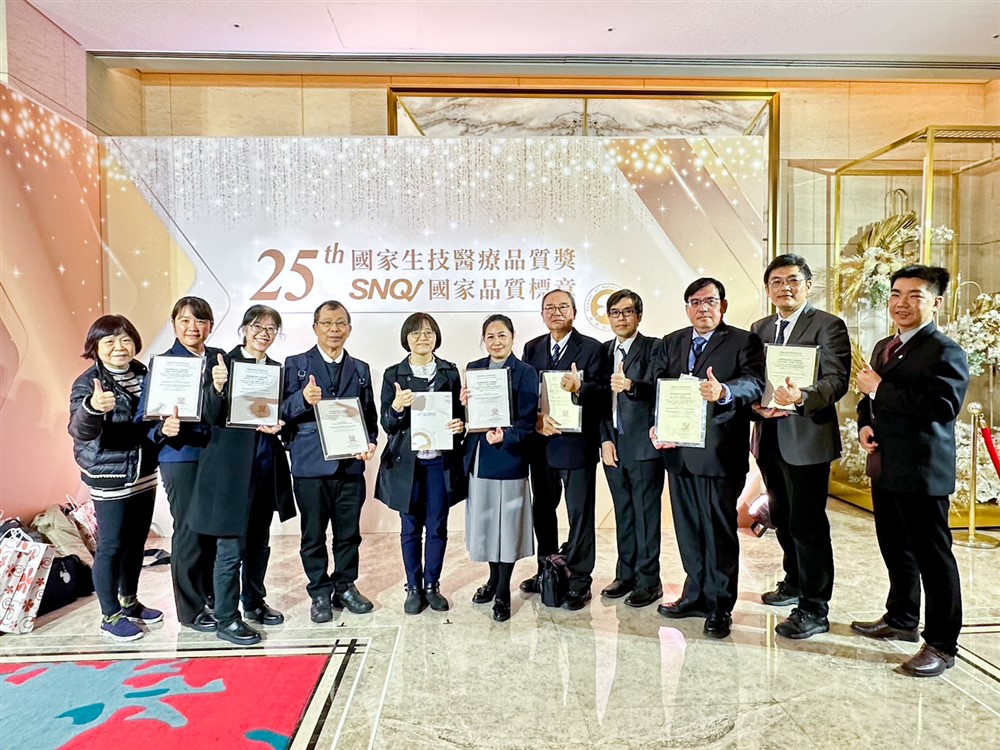 花蓮慈濟醫院獲十三面SNQ 國家品質標章,左起:兒少保護區域醫療整合中心廖夏慧個管師、黃靖淳品管醫檢師、檢驗科張淳淳主任、吳彬安副院長、衛生福利部醫事司劉越萍司長、護理部鍾惠君主任、許文林副院長、癌症研究中心許仁駿主任、劉岱瑋醫師、小兒部張雲傑醫師、放射治療計畫組陳逸偉組長。