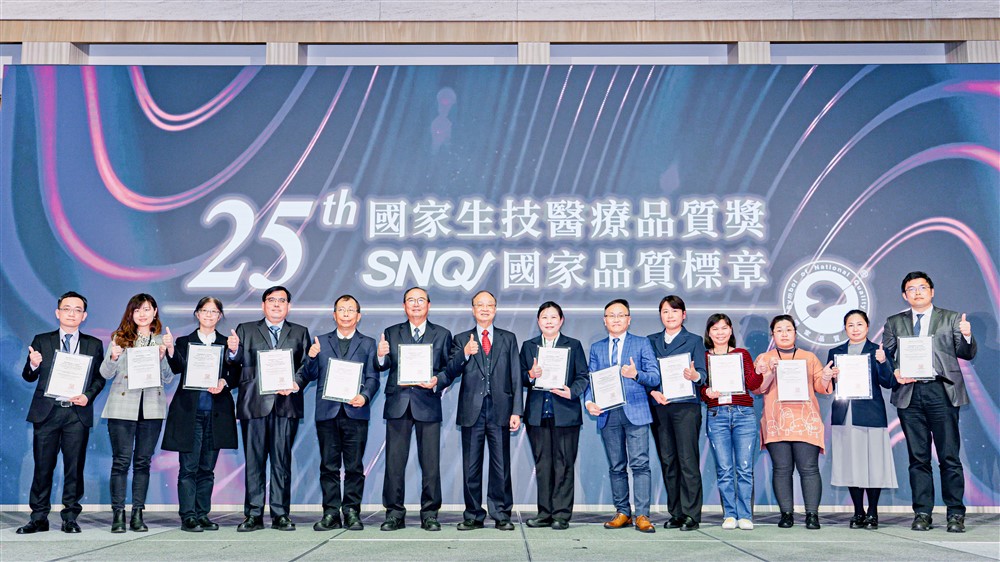 慈濟醫療法人SNQ 國家品質標章合影,左起:臺中慈院大腸直腸科方佳偉醫師、大林慈院放腫科石怡婷技術主任、花蓮慈院檢驗醫學科張淳淳主任、放射腫瘤科劉岱瑋醫師、吳彬安副院長、許文林副院長、生策會陳維昭教授、大林慈院護理部陳佳蓉主任、肝膽腸胃科唐家沛醫師、花蓮慈院檢驗醫學科黃靖淳品管醫檢師、臺北慈院護理部蔡碧雀督導、林秀青護理長、花蓮慈院護理部鍾惠君主任、小兒部張雲傑醫師。