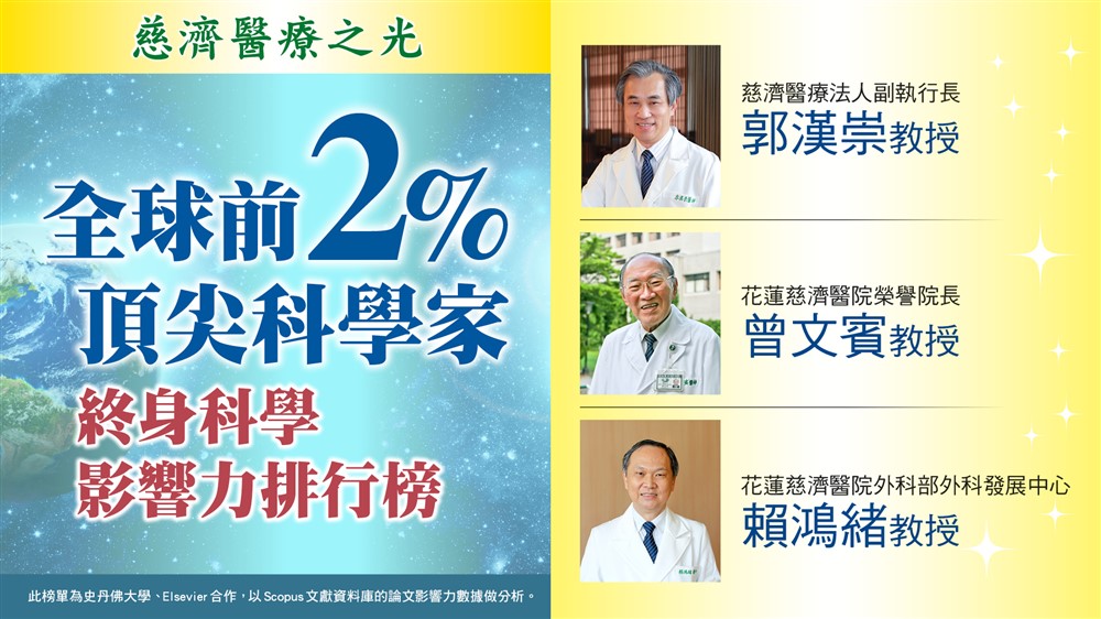 慈濟醫療法人郭漢崇副執行長、花蓮慈濟醫院曾文賓榮譽院長以及外科部外科發展中心賴鴻緒教授,名列「全球前2% 頂尖科學家」終身科學影響力排行榜。