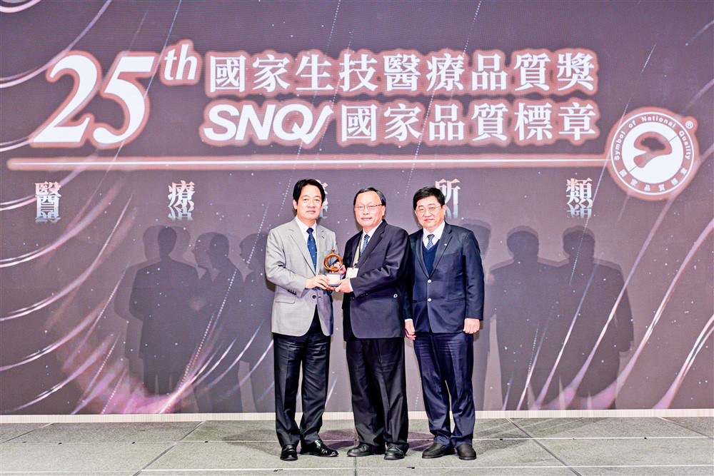 大林慈濟醫院獲國家生技醫療品質獎醫務管理組銅獎,賴寧生院長(中)及林名男副院長(右)於二○二三年二月十四日接受賴清德副總統頒獎表揚。