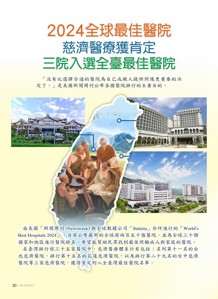 「沒有比選擇合適的醫院為自己或親人提供照護更重要的決定了。」是美國新聞周刊公布各國醫院排行的主要目的。而花蓮慈濟醫院藉由推動中西醫合療,積極創新研究開發,讓世界看見臺灣,看見臺灣東部美麗的花蓮。