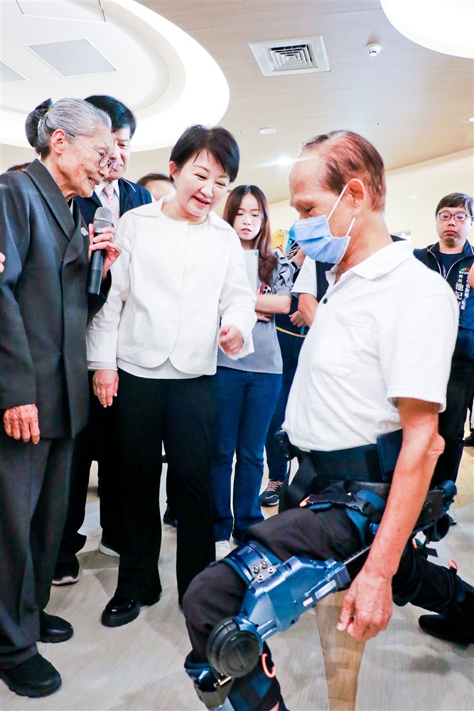 林阿公示範使用下肢外骨骼機器腳,展現慈濟長照的科技醫療。