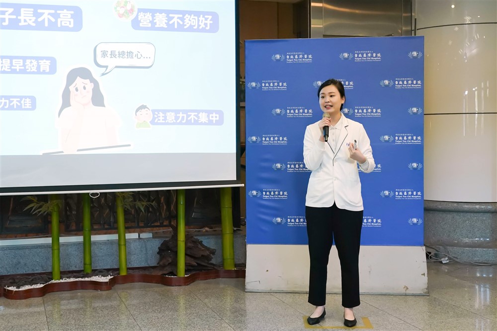 李盈瑩營養師表示,台北慈院營養科團隊以提升住院病人餐滿意度為目標,期待透過具體措施,提高滿意度。圖為李盈瑩營養師為民眾衛教健康飲食觀念。