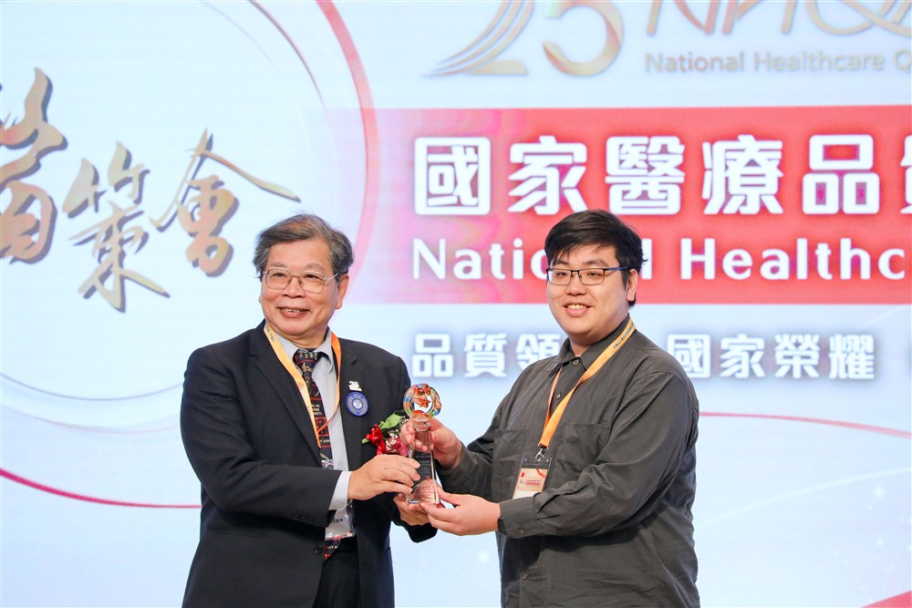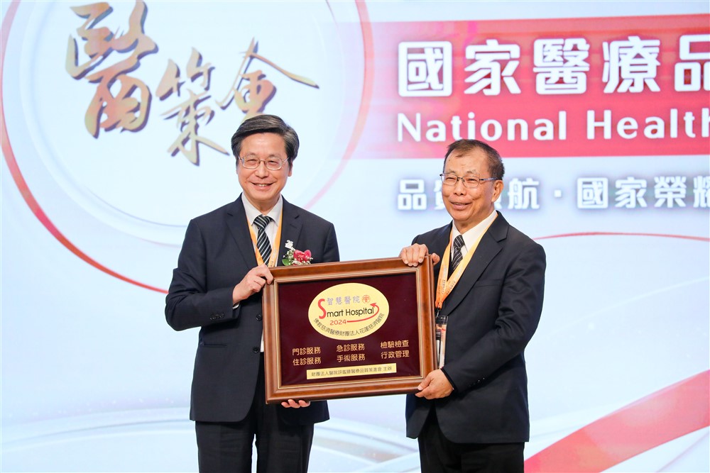 花蓮慈濟醫院在第二十五屆國家醫療品質獎(NHQA)獲頒「智慧醫院全機構標章」殊榮,並由醫策會董事長張上淳(左)頒發獎項,由吳彬安副院長(右)代表受獎。攝影/游濬紘