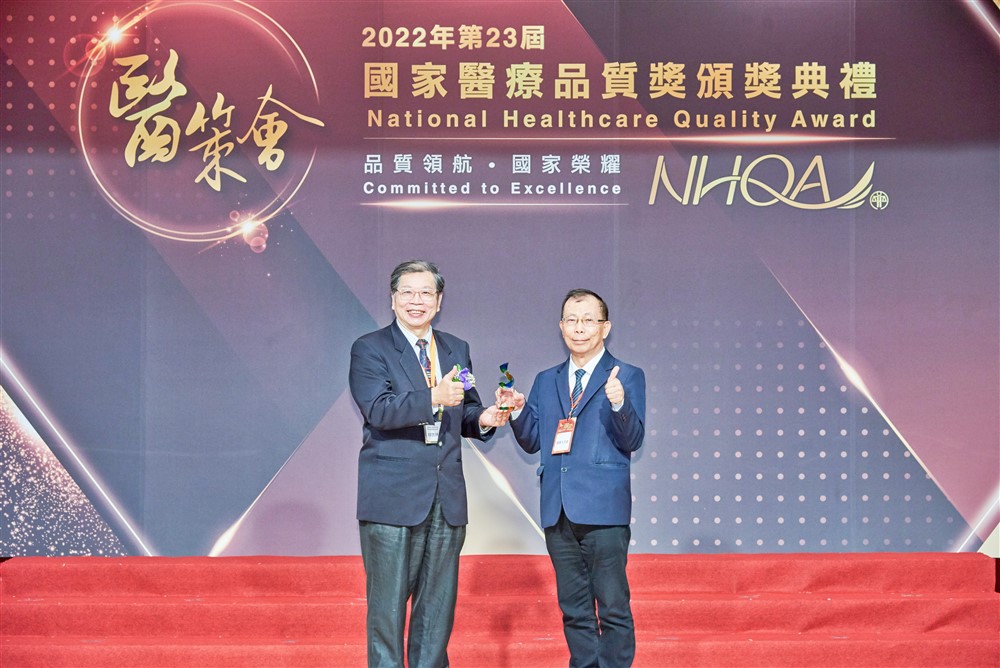 財團法人醫院評鑑暨醫療品質策進會第二十三屆國家醫療品質獎(NHQA),花蓮慈濟醫院獲實證醫學類的文獻查證臨床組銀獎、銅獎、文獻查證新人組銅獎等一銀二銅的佳績,由實證醫學中心主任許晉譯(右)代表領獎。