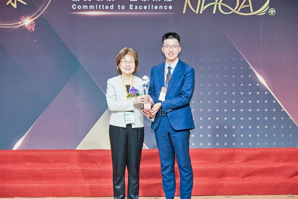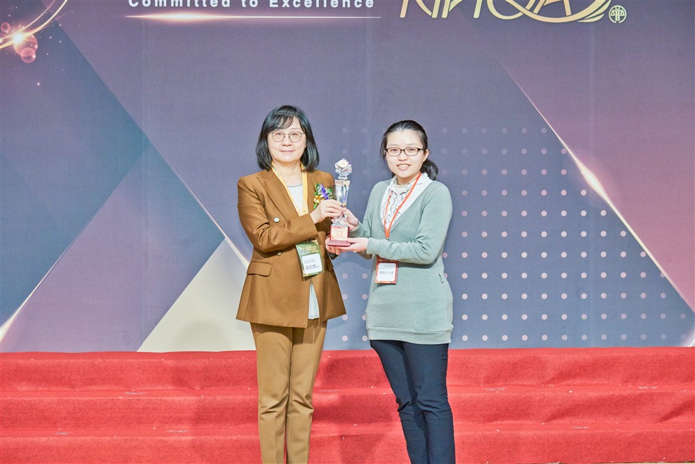 花蓮慈院在國家醫療品質獎實證醫學類- 文獻查證新人組榮獲銅獎,由藥學部李芸瑄(右)代表受獎。