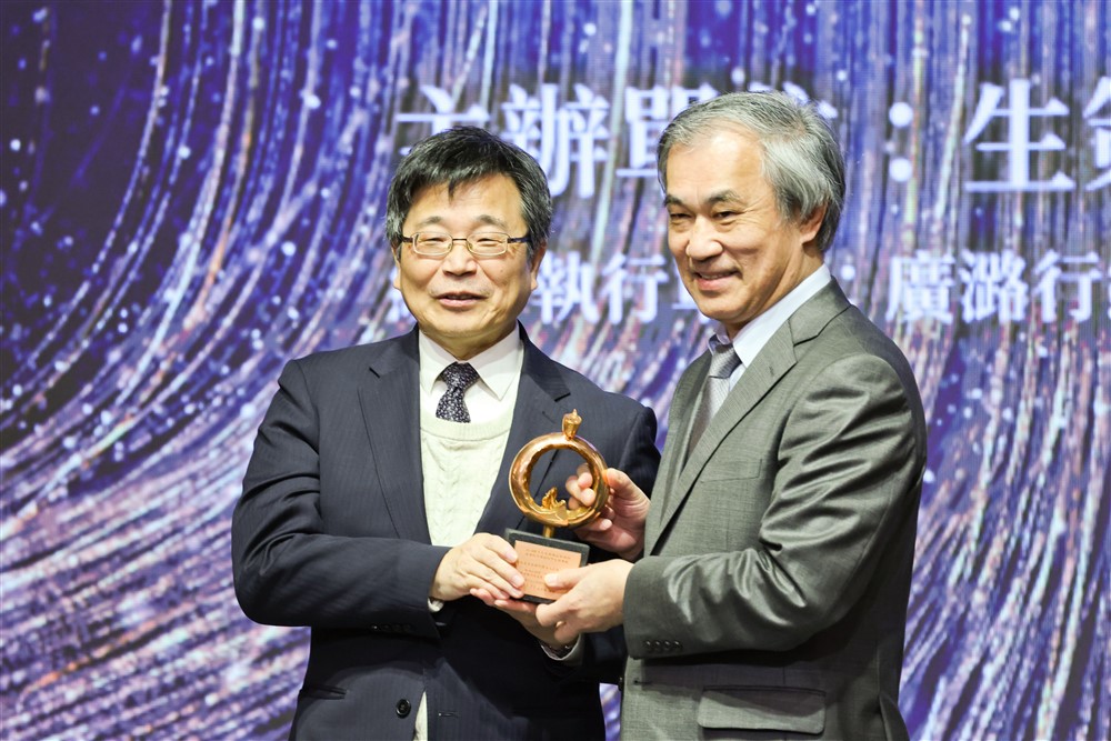 慈濟醫療法人副執行長郭漢崇教授(右)致力於改善脊髓損傷患者的膀胱功能,提升脊髓損傷患者的生活品質不遺餘力,獲得國家生技醫療品質獎銅獎,由衛生福利部周志浩常務次長授獎。攝影/羅景譽