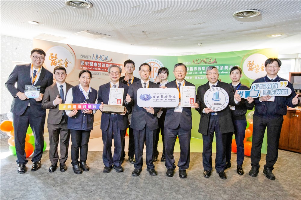 國家醫療品質獎(NHQA)為臺灣重要的醫療品質指標之一。台北慈濟醫院於二○二五第二十六屆NHQA 評選中共獲得十八項獎項,除了智慧醫療類獲得一銅獎、一優選與六標章、淨零醫療類淨零醫療機構組取得優等之外,於主題類取得四佳作,擬真情境類獲得三佳作,展現在醫療品質與智慧創新並進的亮眼成果。二月四日,由台北慈院徐榮源副院長與鄭敬楓副院長帶領各組代表前往領獎。