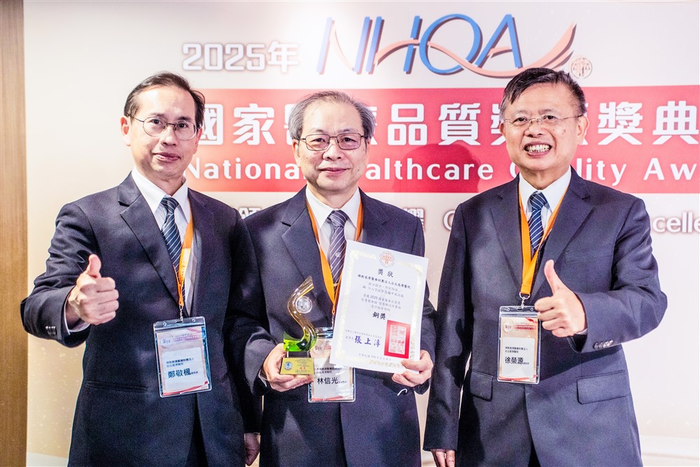 台北慈院神經科、急診部與影像醫學部等團隊攜手的「搶分搶命、即刻取栓:AI 介入下的緊急腦中風救援」,榮獲NHQA 智慧醫療類智慧解決方案組急診服務領域的銅獎殊榮。左起為鄭敬楓副院長、神經科林信光醫師、徐榮源副院長。