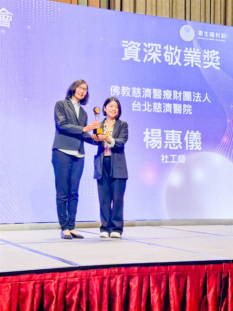 為肯定全臺社會工作專業人員在社會福利服務推動上的堅持與付出,三月二十九日衛生福利部舉辦「助人專業,轉變社會──社會工作專業人員表揚典禮」,臺北慈濟醫院楊惠儀社工師榮獲「資深敬業獎」肯定。
