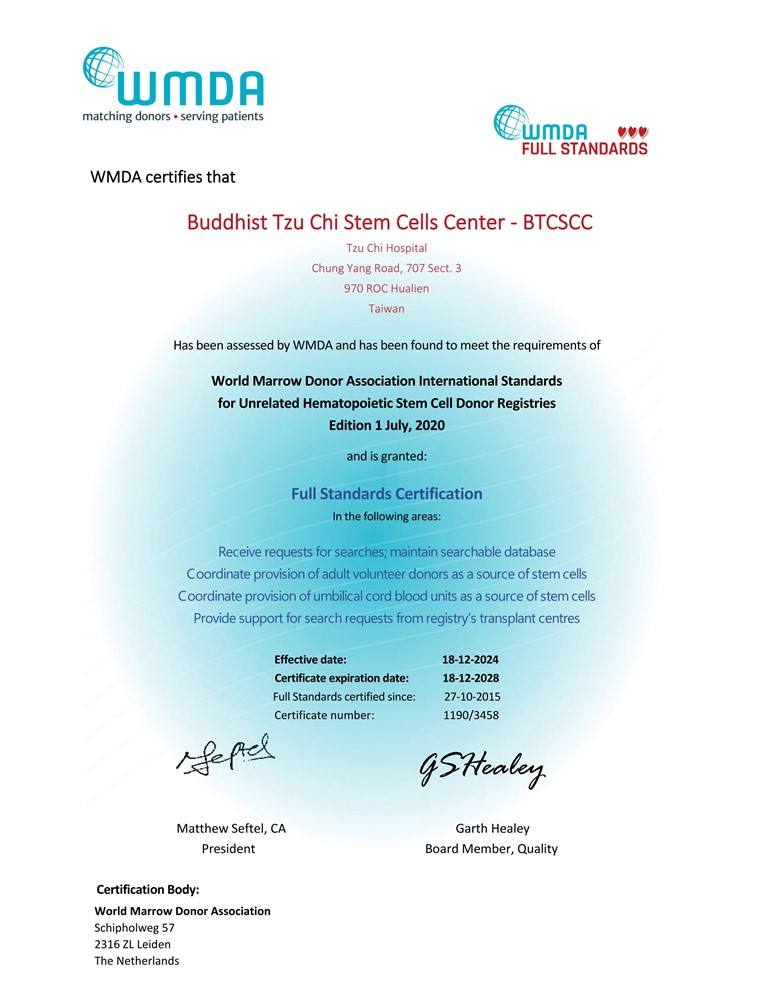 慈濟骨髓幹細胞中心於二○○八年十二月向WMDA 申請認證,二○一○年十月一日通過初階認證,二○一五年首次通過進階認證,二○二○年再度獲得進階認證通過。