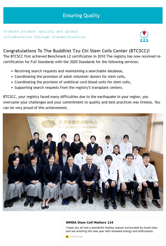 通過WMDA 世界骨髓捐贈協會的進階認證,是對慈濟骨髓幹細胞中心的重大肯定。