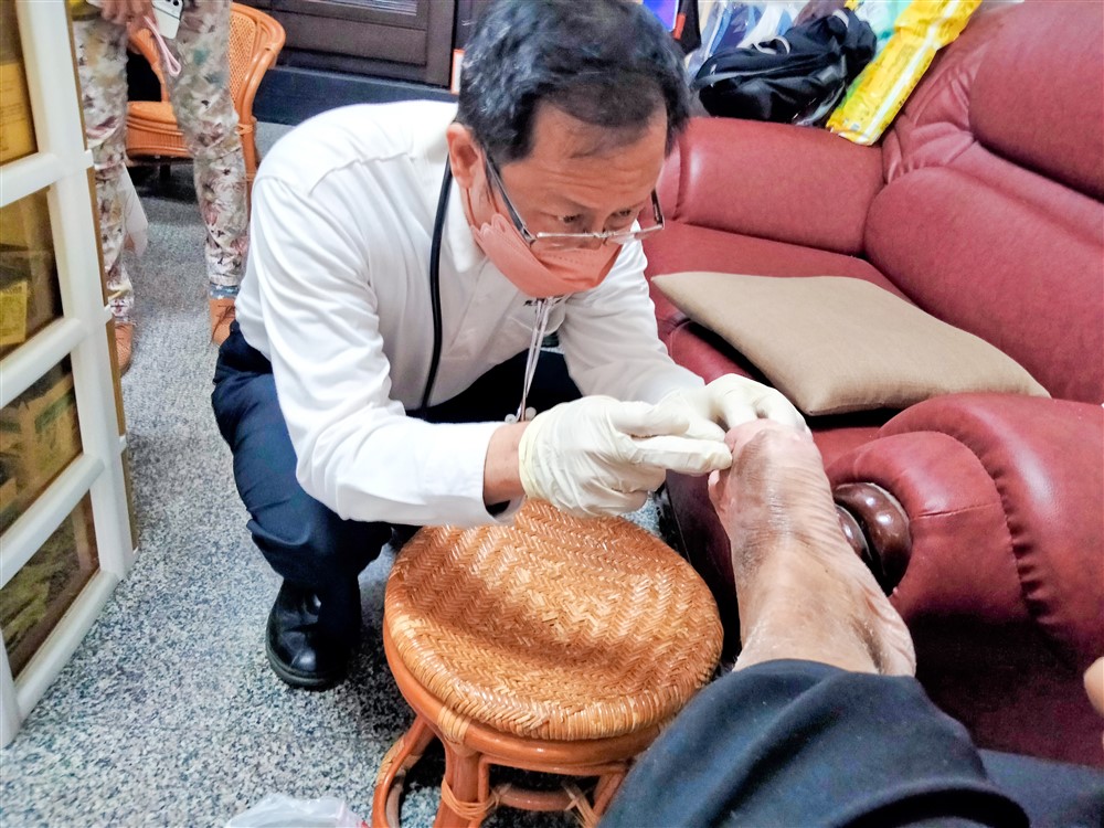 左圖:四月九日彰化慈濟人醫會舉行漢寶村義診暨往診服務,訪視關懷途中,林烱郁醫師為病人細心檢查傷口。