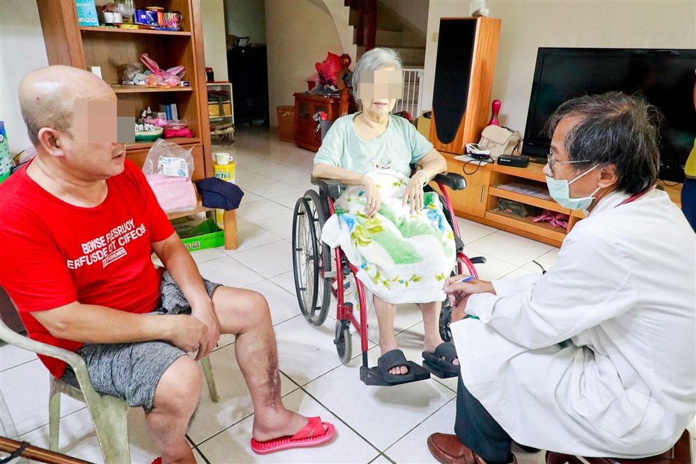 人醫團隊前來探視轉介個案楊家母子。楊先生大約在一年半前發生車禍,右小腿受傷放置鋼板治療時受到感染,雖然已經取出,但傷口一直無法癒合。與他同住的母親三個月前中風,下床行走需要靠助行器或坐輪椅。兩個月不見,王建嘉醫師檢視楊先生的傷口說:「復原狀況不錯,沒有流膿就表示沒有再感染,傷口會慢慢好轉結痂。」王醫師建議楊先生多走路運動,有助於傷口癒合。護理師郭淑宜也細心的為楊先生小腿的傷口消毒換藥。