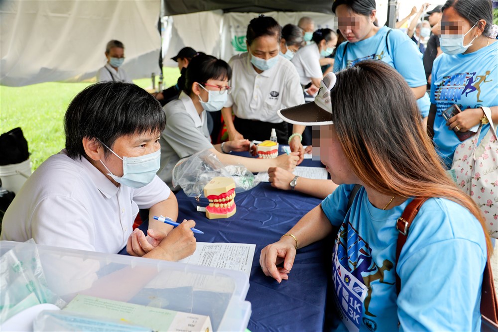 北區慈濟人醫會醫護人員及慈濟志工團隊六月十一日在三重幸福水漾公園廣場設攤,為移工朋友進行義診暨健檢服務。圖為賴秋英牙醫師(左)專注為病人問診檢查。