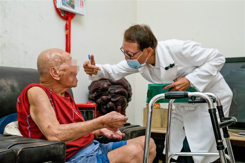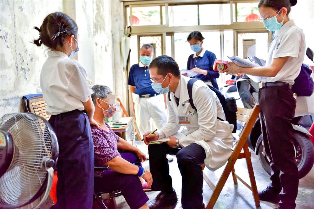 「怎麼這麼久沒來呢?」長者和家屬看到醫護團隊親切問著。廖振凱醫師輕聲地說:「兩個月前才來呢!」長者靦腆的說:「忘記了!」一旁的志工迸出一句:「是阿嬤太想我們了!」逗得長者笑開懷。