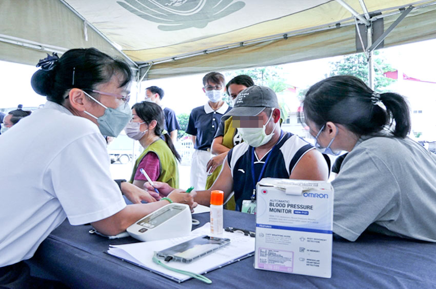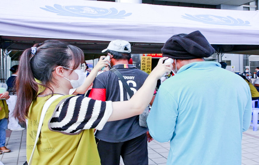 頂著高溫炎熱,志工在外場帳篷區先為就醫的漁工朋友量體溫、酒精消毒手、掛上號碼牌,再引導至報到區。