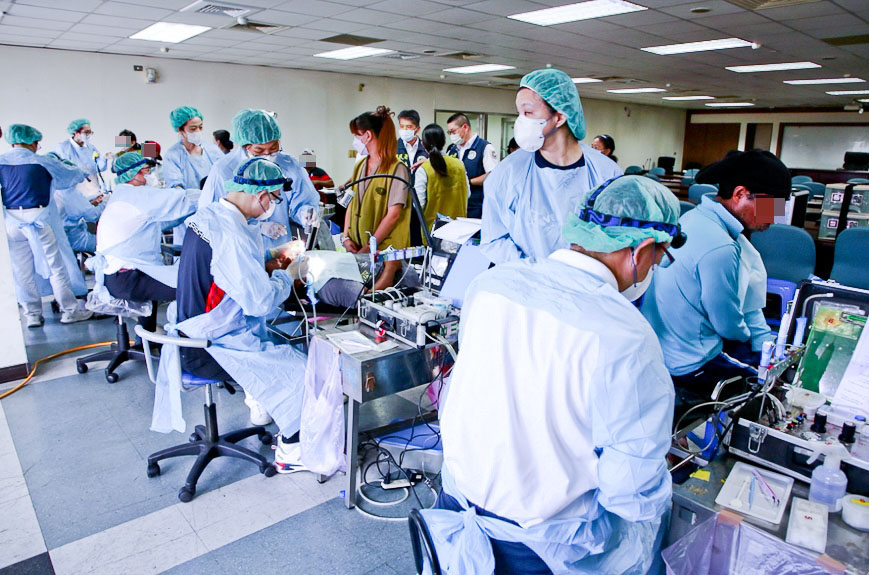 牙科洗牙與治療是最花費時間的。今日牙科診療床設置了五床,在搬器械與組裝上也是花費最多志工人力的。幾位主責的高雄區志工都是經驗豐富的達人,任憑身上豆大的汗珠直墜,依然手腳俐落,合作效率十足。