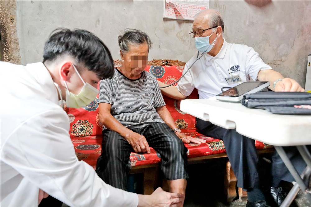 貢寮里往診關懷,沈世雄醫師為老病人聽診。台北慈院PGY 胡睿廷醫師(左)從旁協助檢視阿嬤的腳是否有水腫情況。攝影/黃永福