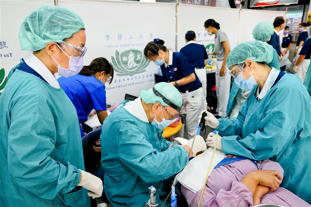 北區慈濟人醫會八月十三日在臺北車站舉辦外籍移工義診,提供多科別的看診服務。謝彥中牙醫師(中)在牙科區為病人診療。