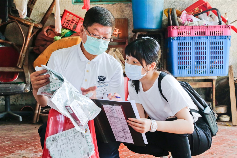 洪茂雄藥師手把手教學傳承,與青年志工藥學系學生蔡思昀分享檢視個案用藥時的注意事項。攝影/吳品俙