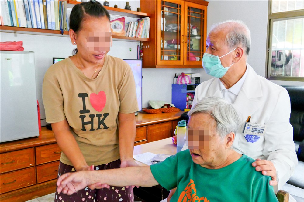 村長線往診關懷,北區人醫沈士雄中醫師為阿嬤按摩放鬆筋膜,同時也教導外籍看護日常如何從旁協助阿嬤做復健運動。攝影/林世欽