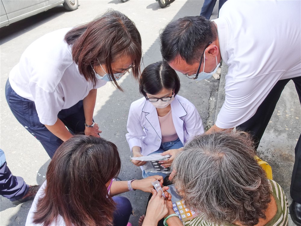 林烱郁醫師(右)與藥師圍著坐在門外的林阿嬤關心健康情況並仔細檢視其用藥。攝影/徐銀娘