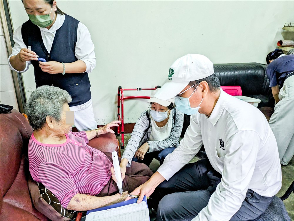 十月二十二日新社往診服務上,中區人醫蔡文芳醫師(右)、鄭宇雅中醫師(中)家訪關懷,為長輩診療。