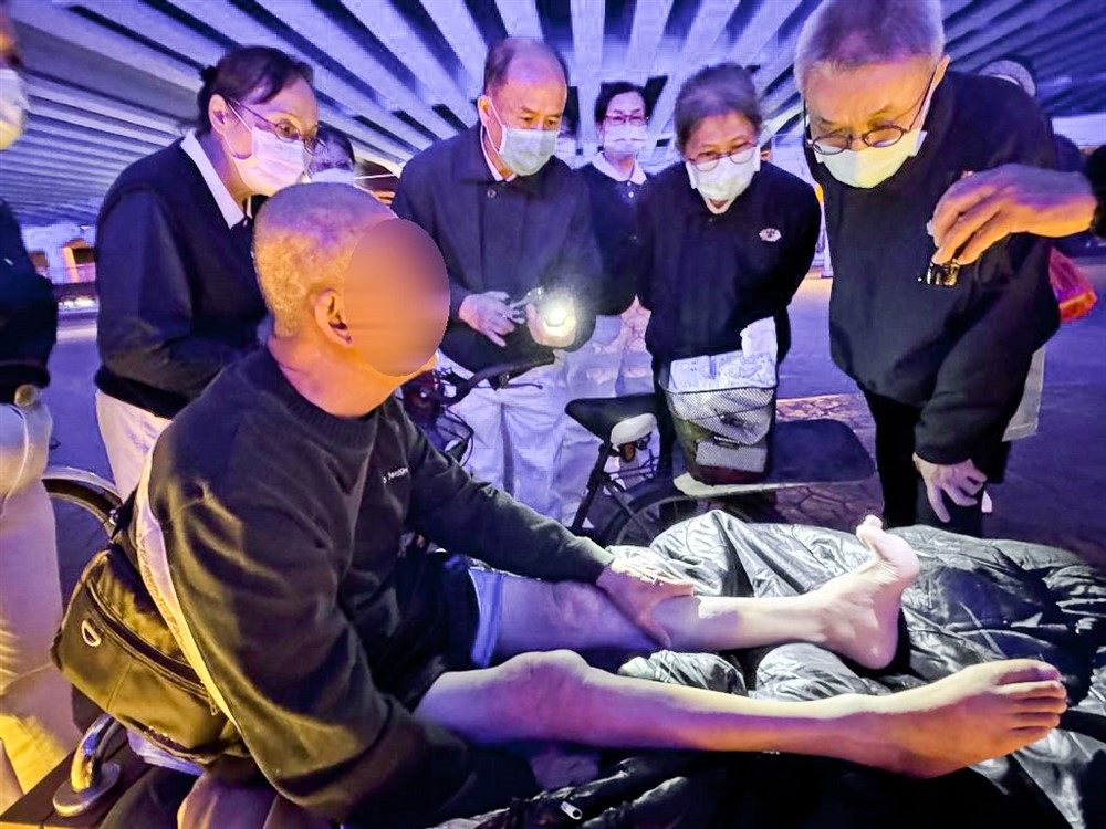 一月六日深夜高雄慈濟志工團隊帶著愛心物資進行街友關懷服務,同行的高屏區慈濟人醫會葉添浩醫師(右一),悉心為身體不適的街友做檢查。
