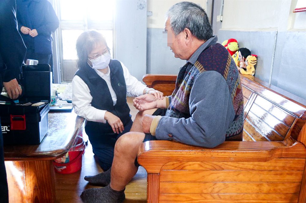 雲嘉南慈濟人醫會一月二十一日舉行往診關懷,為便於診療,大林慈院黃雅慧中醫師直接以跪姿為阿伯把脈問診。