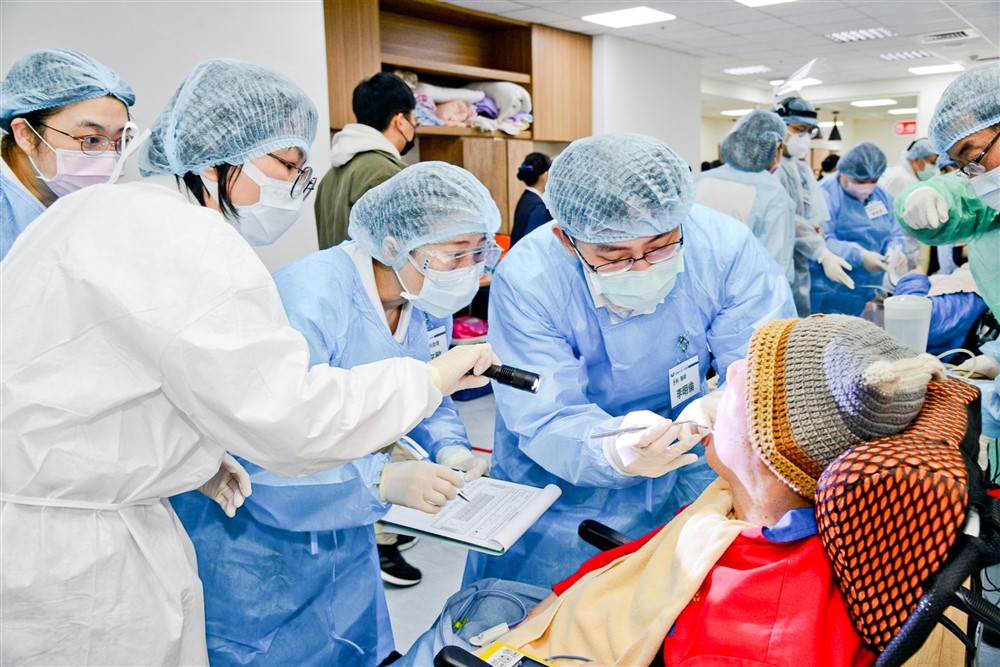 台北慈院許源洋醫師為住民洗牙時,資深人醫謝金龍醫師從旁適時技術指導,也分享醫病互動的經驗;人醫會護理師江彩霞和林淑慧,專注記錄和監測血氧和心跳數據並回報。