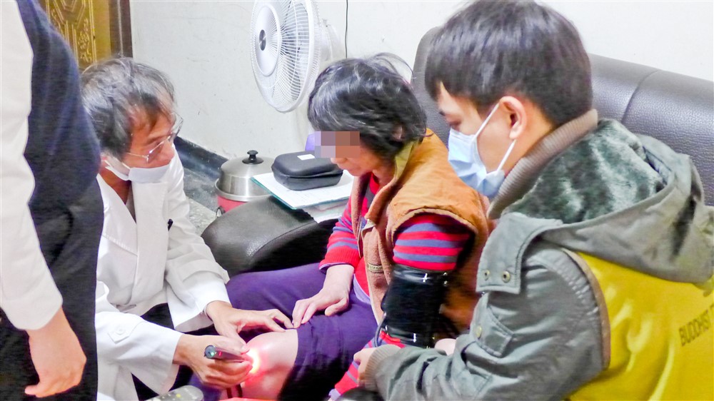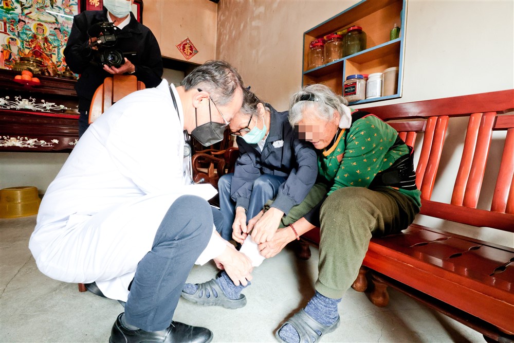 三月十七日進行的貢寮義診暨往診關懷上,北區人醫林啟嵐醫師(左)與戴素蘭護理(中)詳細檢查吳阿嬤雙腿的狀況。