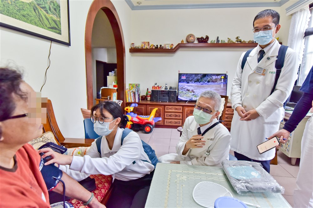 長照記憶居家關懷路線由台北慈院李嘉富醫師與廖振凱中醫師帶隊家訪,個管師吳芯倚(左二)為長輩量測血壓。攝影/余錦豪