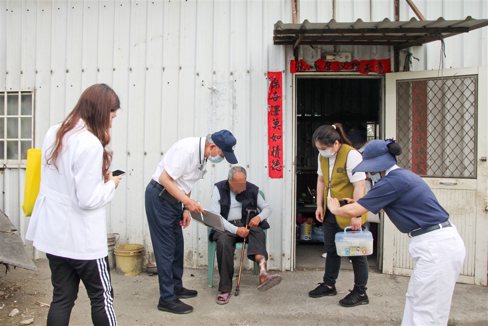 來探望患有糖尿病的阿福伯( 化名)。訪視志工扶著微跛的他,從狹小的鐵皮屋內走出來,到屋外坐著讓醫護檢查問診。本來屋裡有個大衣櫥,占據了通道,讓原已行動不便的阿伯,出入更不容易。在取得阿福伯同意,志工們協助搬移後,行進動線順暢也許多。往診中,除了關心案家的身體狀況,人醫志工團隊也會留意居住環境的安全性,適時加以協助安排處理,讓長者安心安居。