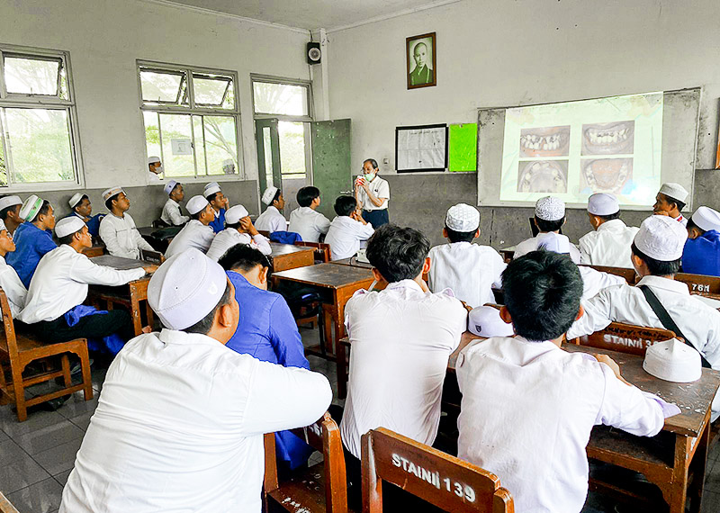 五月五日印尼當格朗市(Tangerang) 慈濟志工結合印尼慈濟人醫會前往茂物縣(Bogor) 巴隆鎮(Parung) 努魯亞‧伊曼習經院(Nurul Iman),舉辦一般科和牙科義診活動,同時提供口腔保健與預防皮膚病的衛教宣導,希望能夠帶給學生們正確的健康觀念。