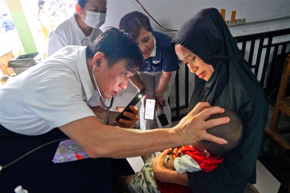 義診上有不少父母帶著幼兒前來就醫,在一般科看診的印尼人醫賴慶安是兒科醫師,協助為小病人診治。賴醫師叮嚀,「沿岸居民容易會出現皮膚病、腹瀉、以及上呼吸道感染等傳染病症,建議鄉親保持個人衛生、勤洗手。」