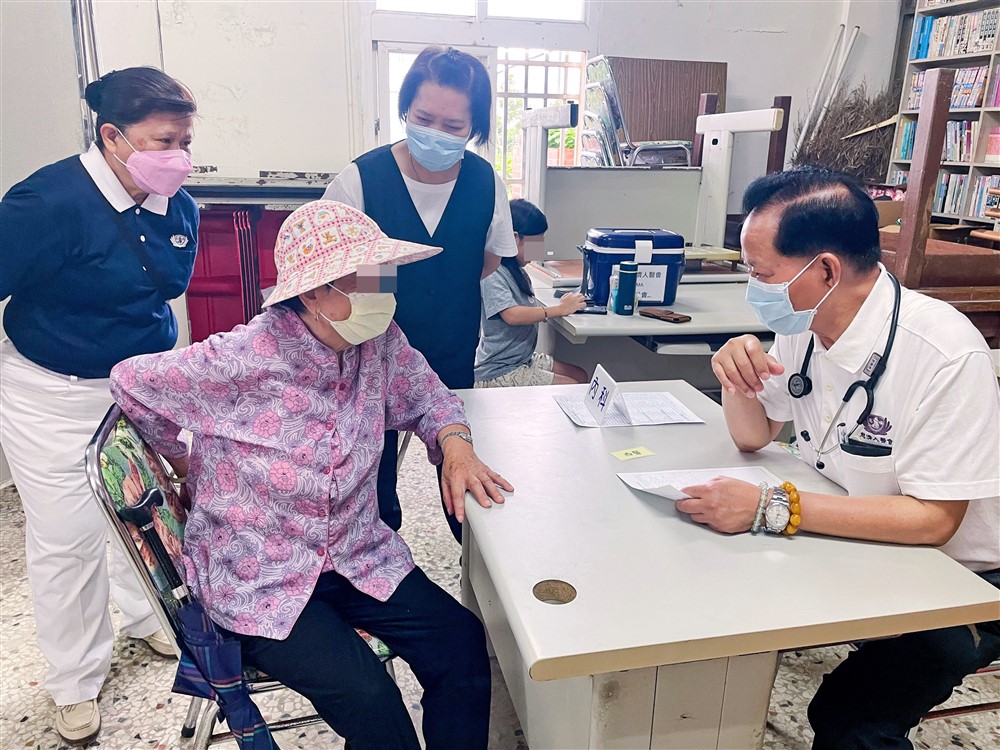 彰化人醫志工團隊六月九日進行漢寶村義診暨往診服務。社區活動中心的定點義診上,郭顯懋醫師細心為阿嬤問診檢查。攝影/黃琳惠