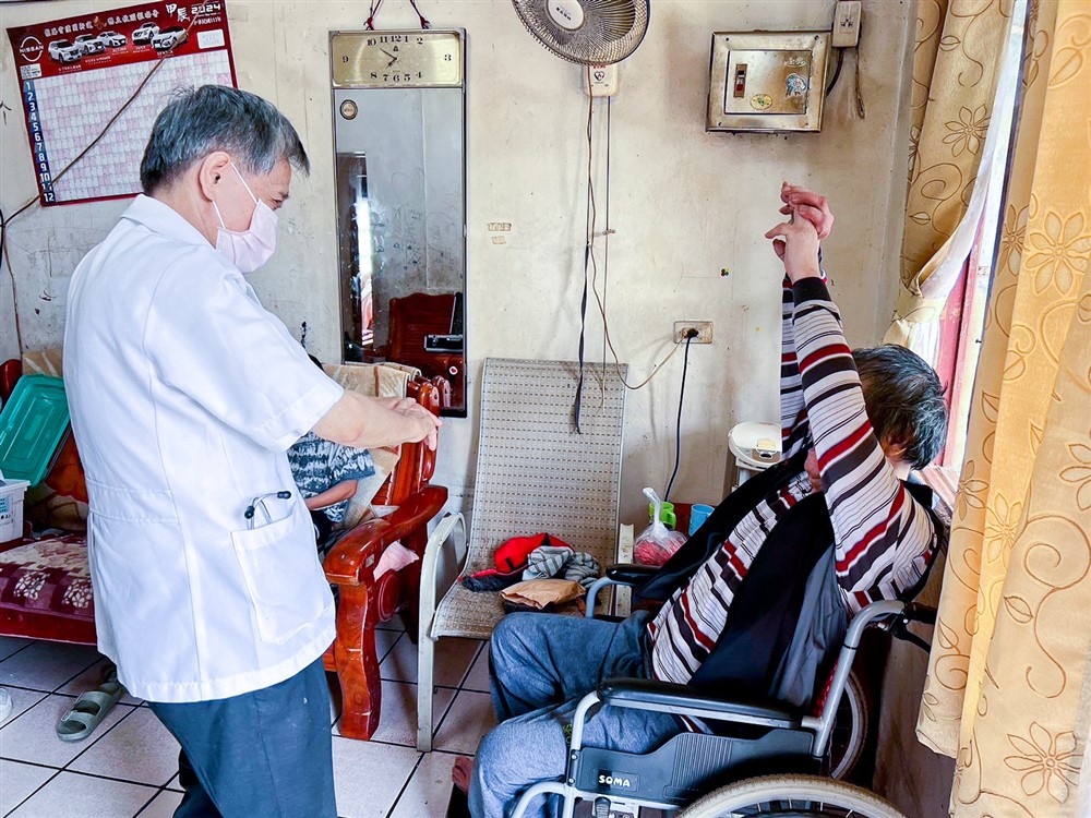 蕭瑞和醫師往診關懷,讚許阿麟大哥的舉手復健運動很標準。