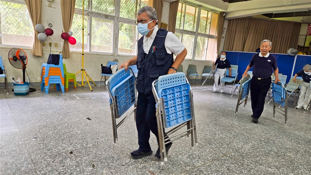 定點義診在東河國小活動中心舉行,隨和的張東祥醫師與志工一起幫忙搬桌椅整理義診場地。攝影/黃靖懿