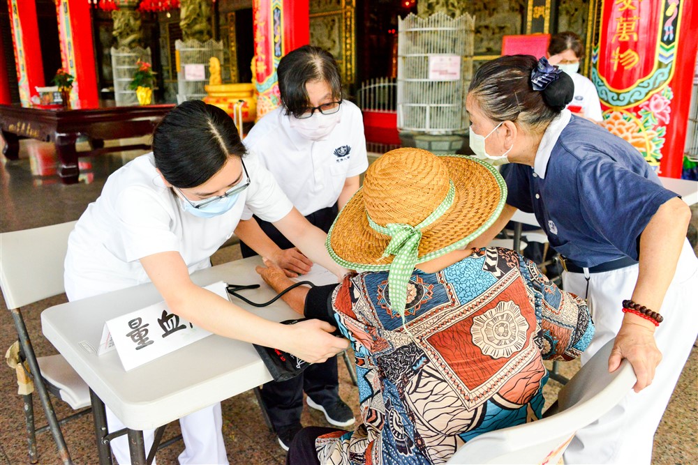 福隆東興宮定點義診上,護理師先為前來就醫的鄉親量血壓,志工親切陪伴扶持。